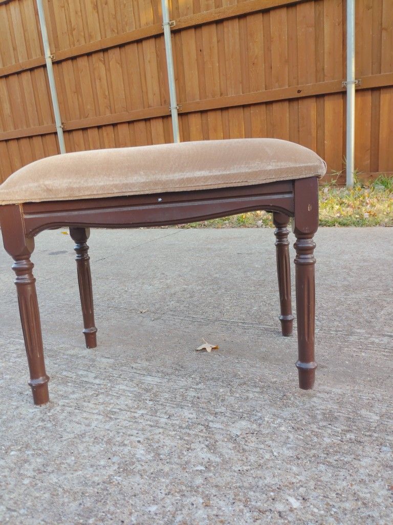 Vintage Hollywood Regency Style Footstool Solid wood frame, upholstery is old useable as is Approximate measures: 25'' Wide, 16''deep and 19'' tall See less Dimensions 25ʺW × 16ʺD × 19ʺH Styles Hollywood RegencyTraditional Seat Height 19.0 in Period Late 20th Century Item Type Vintage, Antique or Pre-owned Shop Sustainably with Chairish Materials UpholsteryWood Condition Good Condition, Unknown, Some Imperfections Color Brown Condition Notes in extraordinary vintage condition, wear consistent with age and use Great construction and quality Please zoom out pictures to inspect Some color variation in photos of our furniture finishes and fabrics is possible due to the lighting and different color resolution on computer
