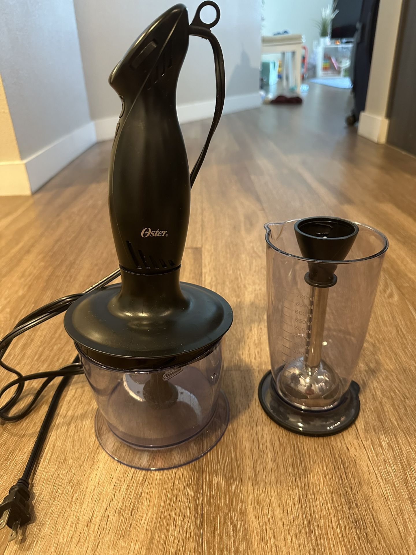 Oster hand blender set in good working condition. Comes with a powerful motorized handle, detachable blending stick, chopping bowl with stainless steel blade, and a measuring/mixing cup. Great for making smoothies, soups, sauces, baby food, and quick chopping tasks. Easy to use and clean.