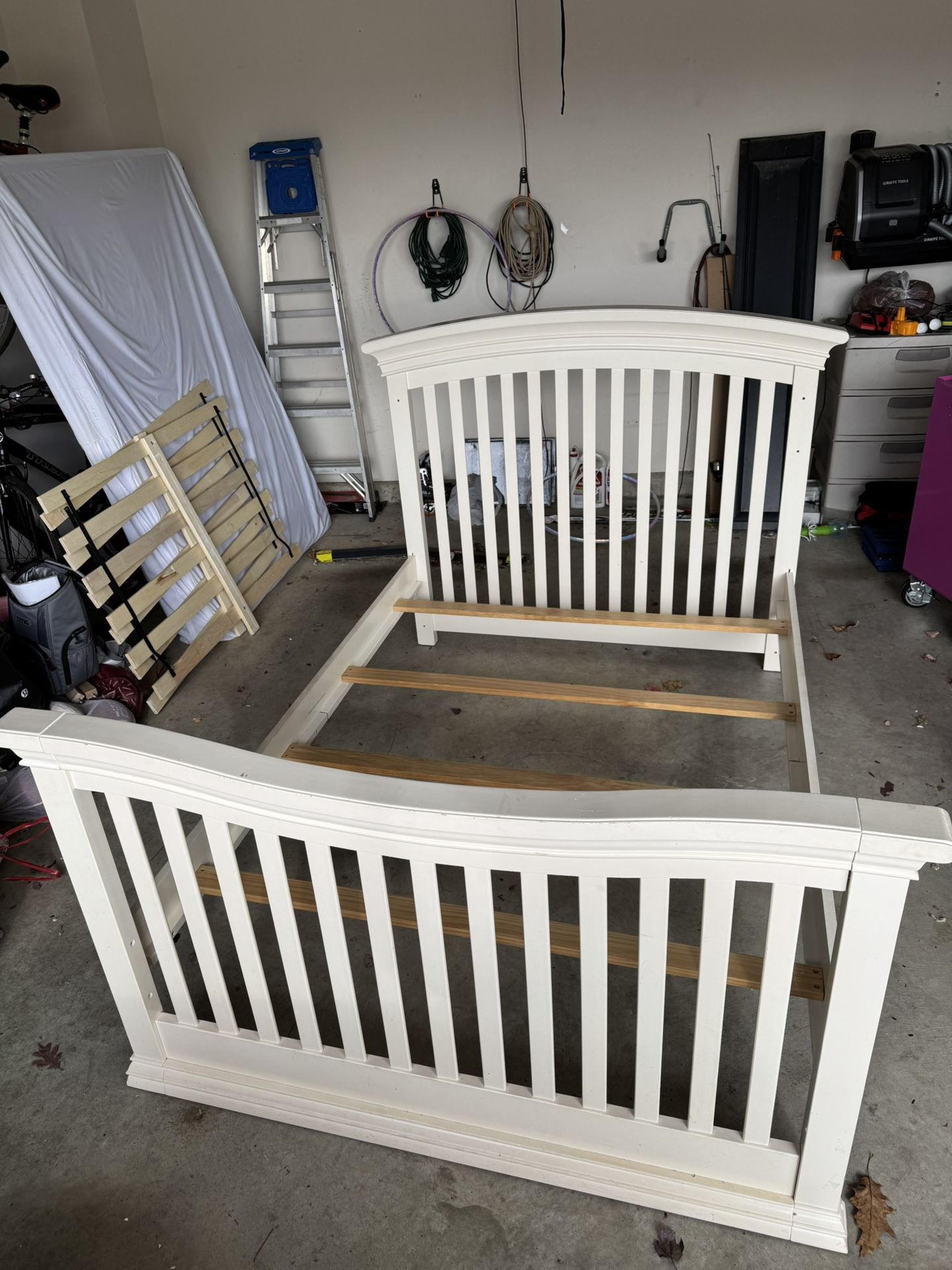 Off white Full size wooden mattress frame. Comes with metal box frame as well. Headboard is 50” tall, footboard is 38” tall.