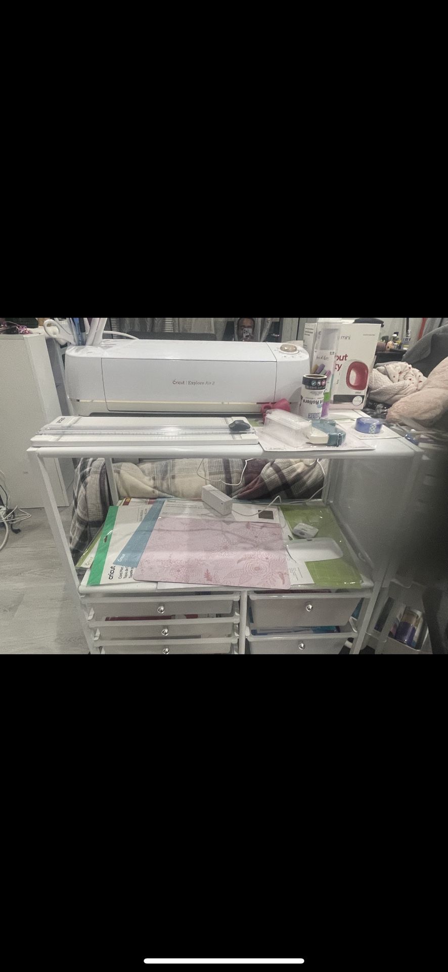Everything works PERFECT. Used only twice and a lot brand new Includes —— • Cricut explore 2 • Cricut easy press • Heat machine • heat transfer paper for ( white and dark clothing ) • Cricut pens • Cricut markers • every tool for needling and more • easy press mini • 12 iron on patches • Decorative healing mat • 3 12” x 12” strong grip mat • 2 long grip mat • applicator / remover roller • rotary cutter • Cricut roll holder •Cricut LED Matt • Cricut joy smart vinyl • iron on gold letters • printable stickers Invisible ink transfer sheets • 19 everyday iron on vinyl • 4 premium vinyl • Tagging tool • Cricut cutting ( for cutting vinyl ) • 2 Heat transfer tape • 6 piece vinyl holders • 2 brand new pack of printing copy paper • finger vinyl trash • lint roller • a couple of cotton shirts to design INCLUDING WORKING TABLE AND VINYL STAND SHELF !!!! everything you need to start your business!!!!