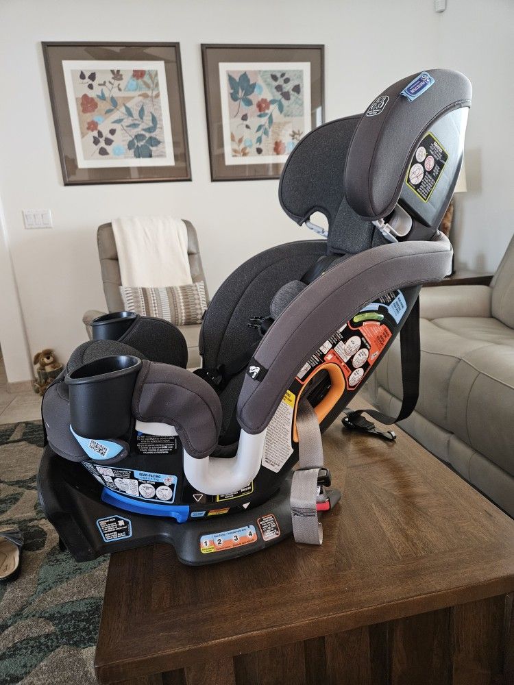 Graco Turn2Me carseat. Retails at $400. Swivels from rear facing to side loading position easily! This seat was so helpful for me to lift my grandson into the seat, secure the harness, and swivel him to the locking, rear facing position. Pressing two buttons, I could turn him to face the door and unload him. Excellent condition.
