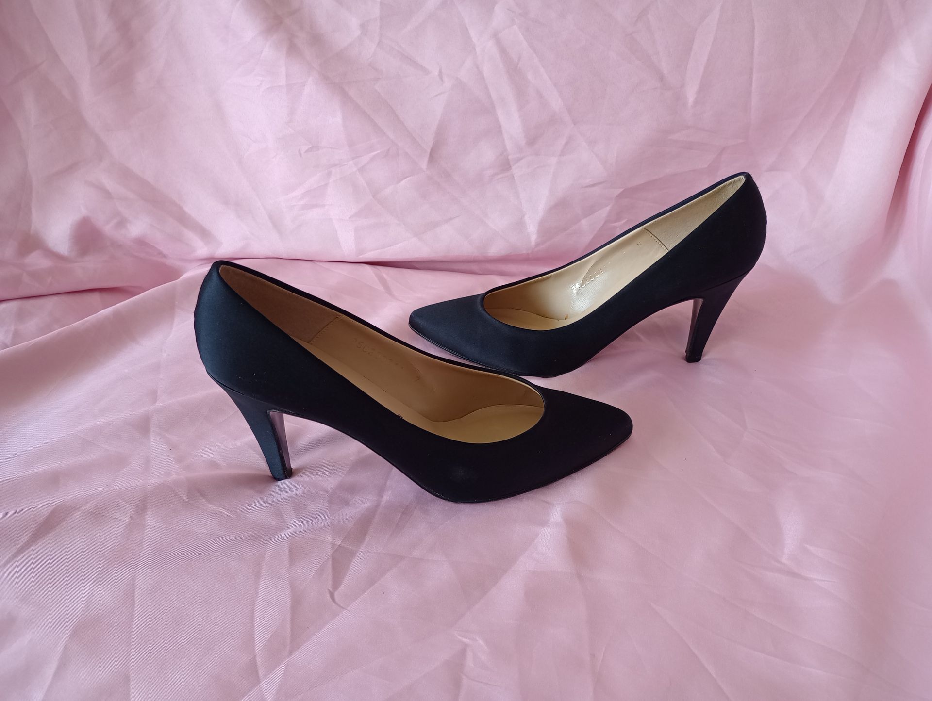 Caressa Rebeca Vintage Black Satin Pumps 7m Black Tie Formal Prom In fair condition has no rips or tears but they do have wear/damage on the bottom of the shoes and the inside walls are starting to crack/peel as you can see in the pictures. See all pictures for more details and measurements.