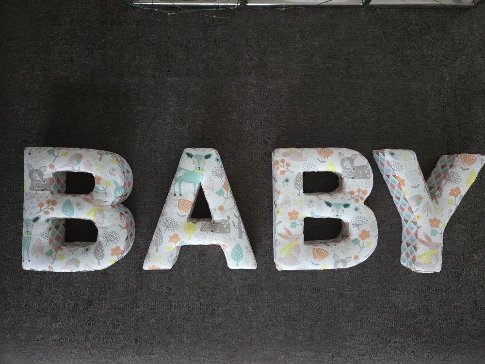 B-A-B-Y Cute padded woodland fabric letters for Baby Shower or Nursery decoration. Hand crafted. I spent MANY hours working on these. They are completely covered. (front, back, and sides) Perfect condition Approximately 7" tall, "B" approximately 6" wide, and approximately 2" wide (Can also spell out ABBY) 💵 Cash only -no apps Pick up from: Bothell, Mill Creek, South Everett, Woodinville, or Tumwater or Olympia area