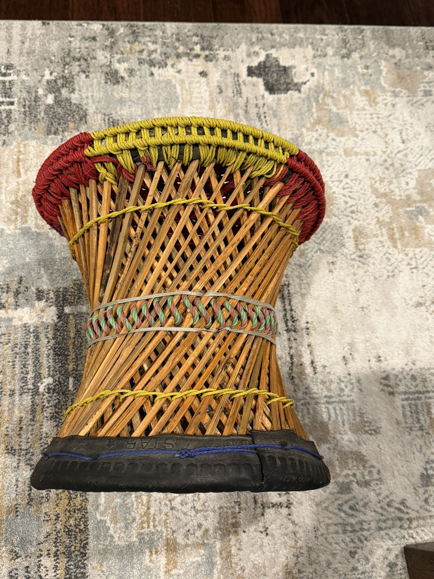 Beautiful, authentic Nepali stool handcrafted with a woven bamboo body and colorful hand-woven nylon rope seat. Features a sturdy recycled rubber base for durability and stability. Lightweight yet strong, perfect as a low seating stool, accent piece, or boho décor. Great for living rooms, meditation spaces, or cultural décor.