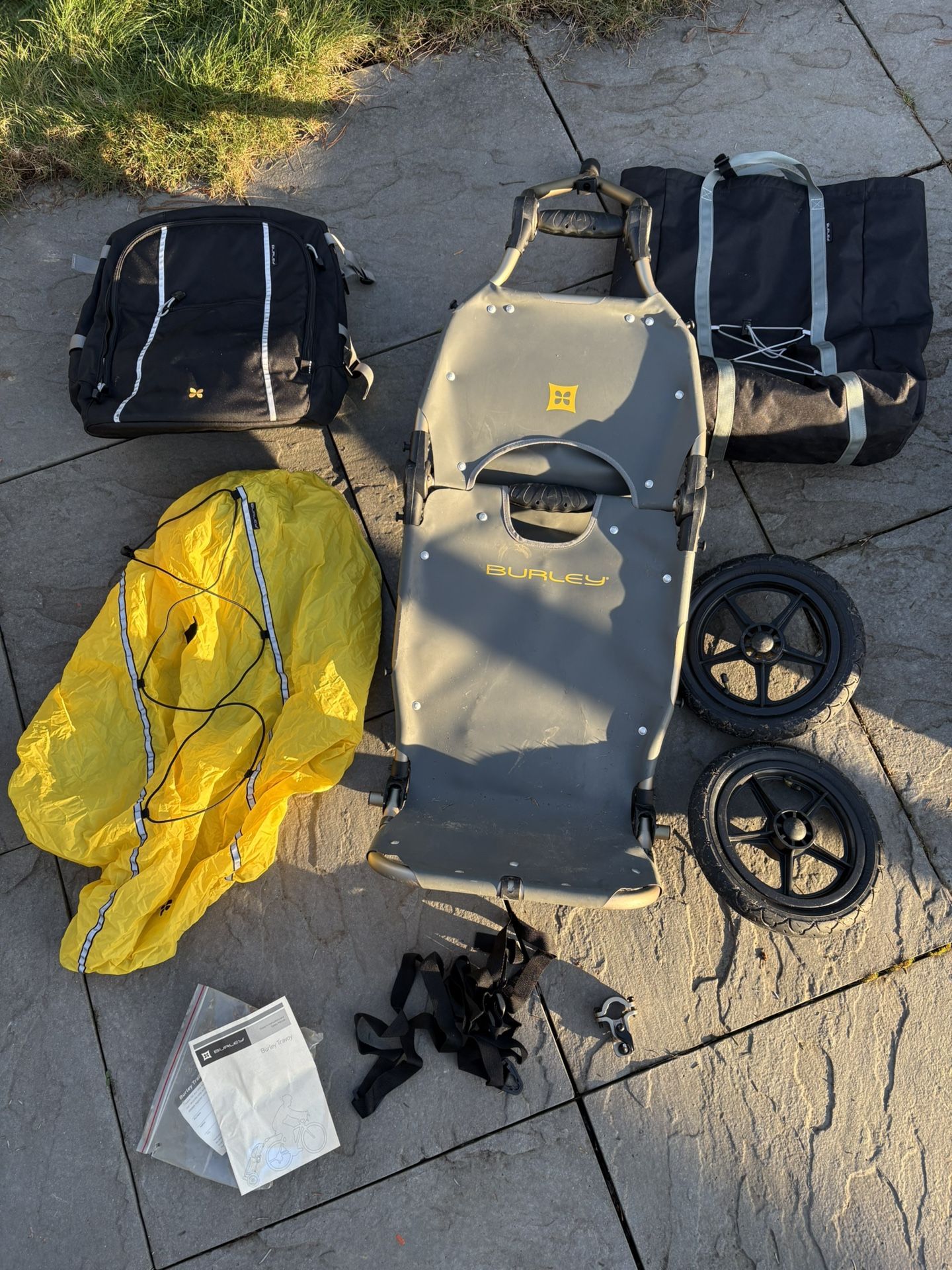 Burley Travoy cargo bike trailer in good used condition. Excellent for groceries, gear, and everyday bike hauling. Includes: • Burley Travoy trailer • Two original cargo bags • Rain cover • Bike hitch mount • Original manual and tie-down straps Notes on condition: • The bottom does not lock closed for standing (broken), but the trailer rolls and functions normally when attached to a bike • Normal cosmetic wear from use Stored indoors. Everything needed to ride and haul. Cash or Venmo. Pickup in Burien.