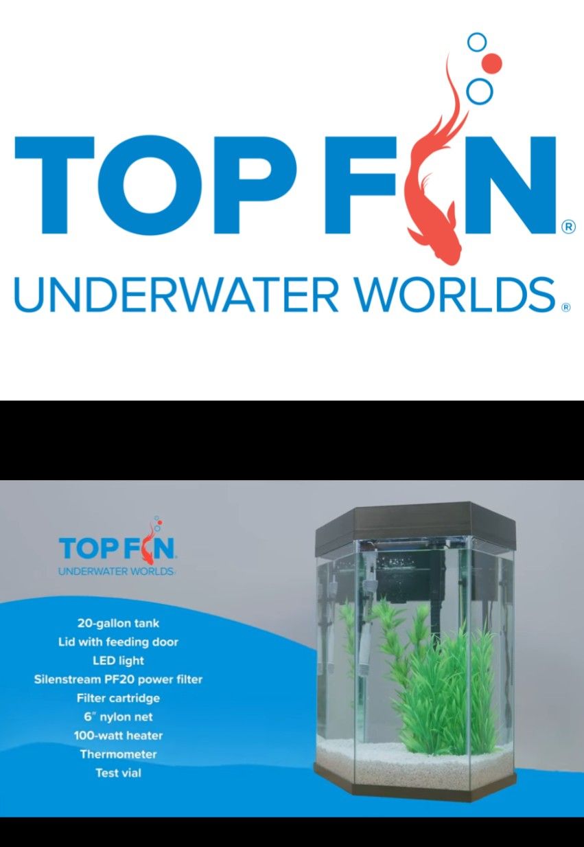Brand new never used/unopened. MSRP $134.99 ASKING $75 OBO DESCRIPTION Secure everything you'll need to provide a beautiful underwater world and a great home for your fish with this Top Fin Aquarium Starter Kit. This kit begins with a 20-gallon glass tank and includes everything you'll need to make it a great home. Features: 20-Gallon Glass Tank with Hood Hood with convenient feeding hole LED Light 1Top Fin Silenstream Large Filter Cartridge 1 Top Fin Silenstream 20 Power Filter 100-Watt Heater Thermometer 6 inch Nylon Net Sleek top design hides your filter Includes: 20-Gallon glass tank with hood LED Light 1 Filter 1 Filter Cartridge 1 Heater 1 Thermometer 1 Net Intended Pet(s): Fish Product Dimensions: 19.1 In L x 16.6 in W x 24.4 in H (48.5 x 42.1 x 61.9 cm) Capacity: 20 Gallons (75.7 L)