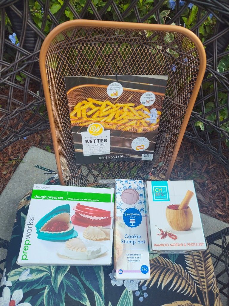 All new ! Cookies press set, 10 inches by 16 inches crisper pan, bamboo mortar & pestle set 2 piece dough press set. $15.. For all !