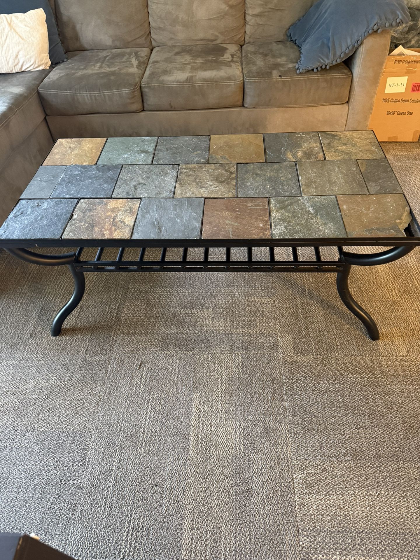 Aesthetic stone tile coffee table with sturdy metal frame. Storage shelf underneath stone top. Tiles are removable. Table dimensions (L x W x H) 4’x2’x1’6”