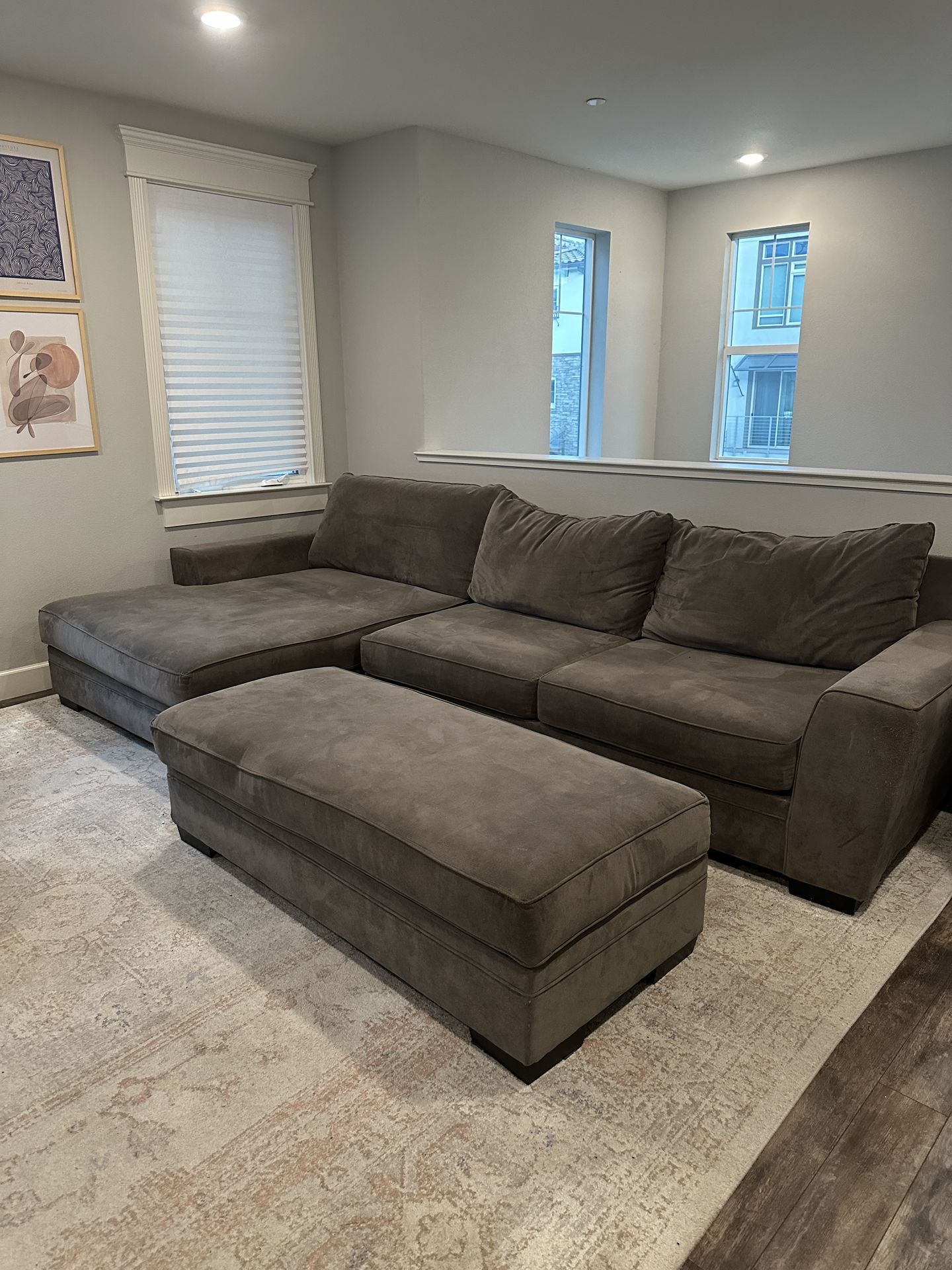 Priced to move! 138” wide. We’ve had this couch for 2 years. It’s so comfy and we’re sad to let it go but it won’t fit in our new place. Includes the ottoman which when pushed in, can create a full bed / additional lounge space. There is some slight wear from our cat on the right arm however otherwise there’s no damage and in great condition. Available for pick up. Couch is located on second floor of our home. I strongly suggest a few strong people to move it and a large truck or pickup. it can be separated into two pieces between the chaise and the sectional.