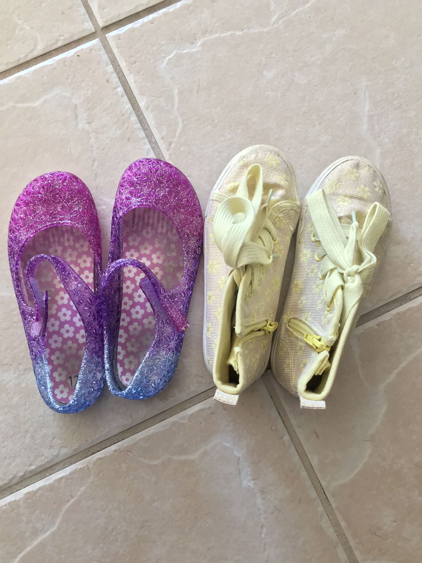Girls shoes, bathing suits, suitcase