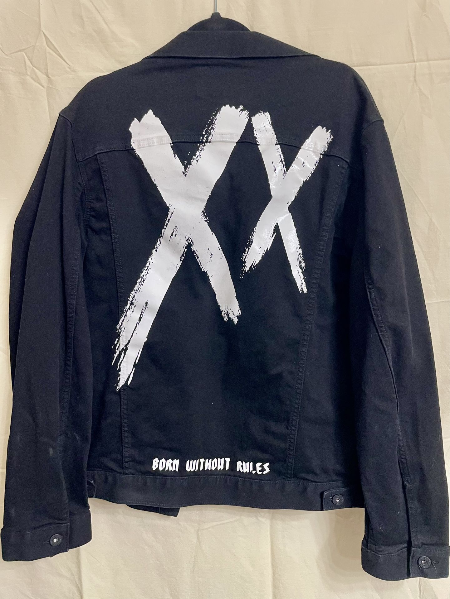 Men’s cult of individual reality, black fashion jacket size extra large features bold double X graphic on back with Board without rules text snap front with zip detail excellent condition no holes or stained smoke free home