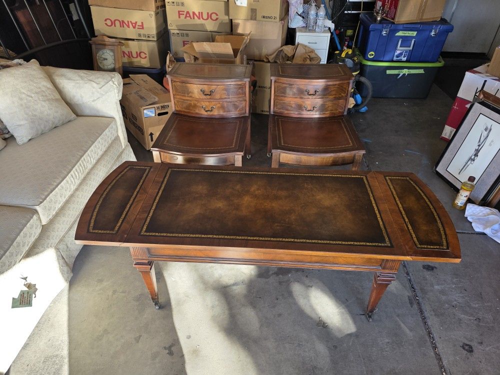 Antique Mahogany Tables Made In 1955 - 2 Side Tables And A Coffe Table With Leather Inlays