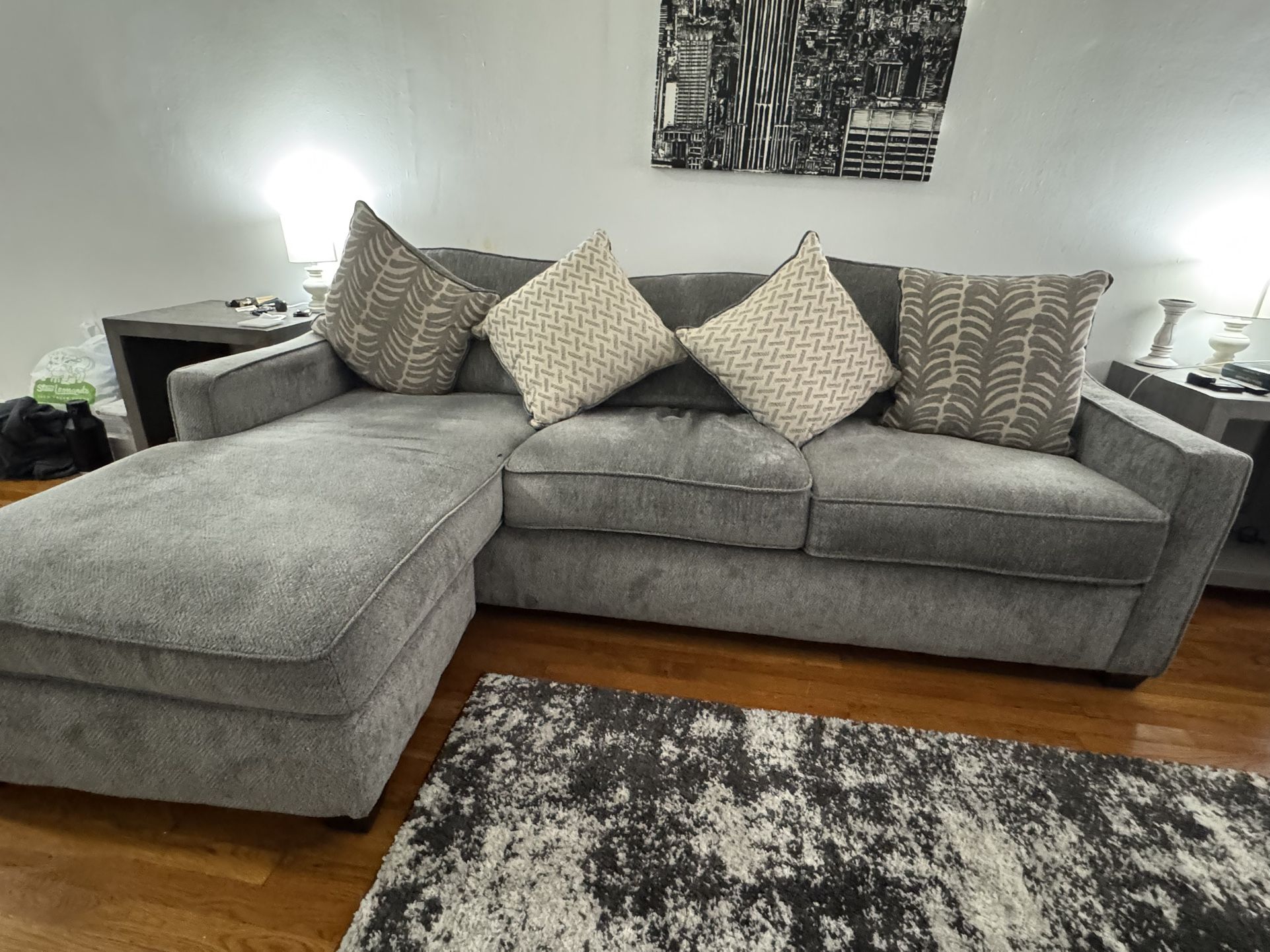 Large grey sleeper sofa / sectional with chaise in solid condition. • Model: Willow Queen Sleeper Chofa (Bob’s Furniture) • Original price: $2,098 • Pull-out queen-size sleeper • Cooling Bop mattress • Includes pillows ⚠️ Futon has 2 small marks (cosmetic only, shown in photos). Pickup only. Cash or Zelle. Buyer brings help.