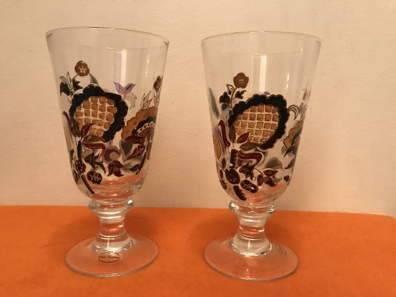 Beautiful hand painted glassware. New with stickers still on them. Great gift idea. Very unique. 7 1/2 inches tall