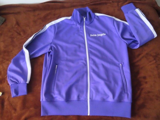 NWOT excellent shape Palm Angels purple Track Jacket White Stripes Logo Size 2XL pit to pit 24.5 shoulder to cuff 25 shoulder to shoulder 18.5-18 3/4 top to bottom 27