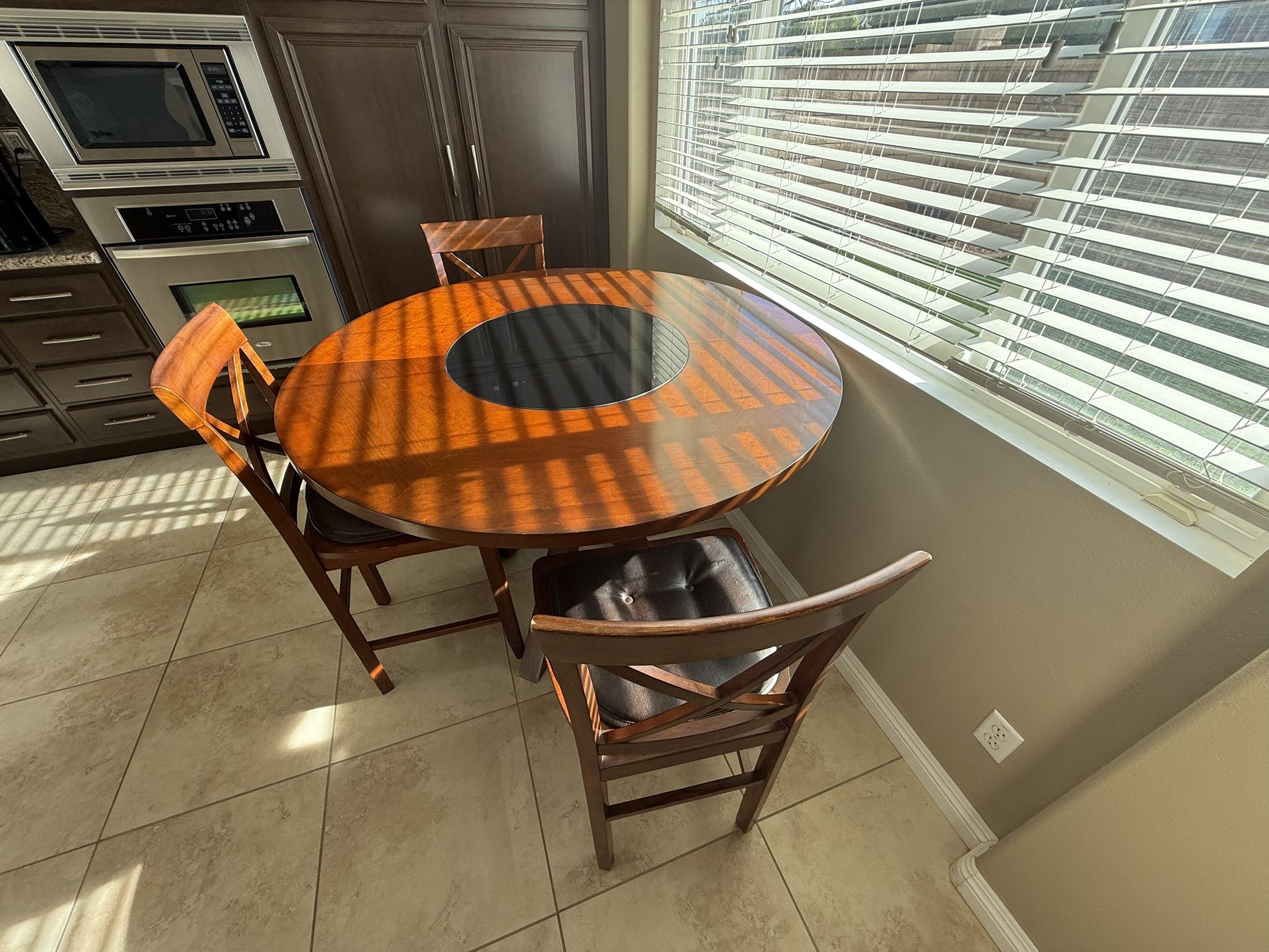 Wooden dinette w glass center Lazy Susan. Six wooden chairs with seat cushions. Table: 4 1/2ft Diameter 36” height