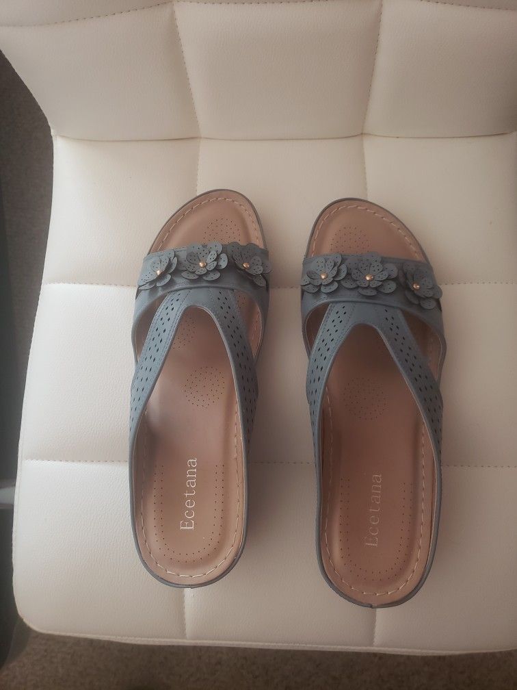 Cute ladies sandals with little flowers. Light blue. Only wore one time, didn't fit me. Size 9. Must pick up in Homeland, Ca 93548.