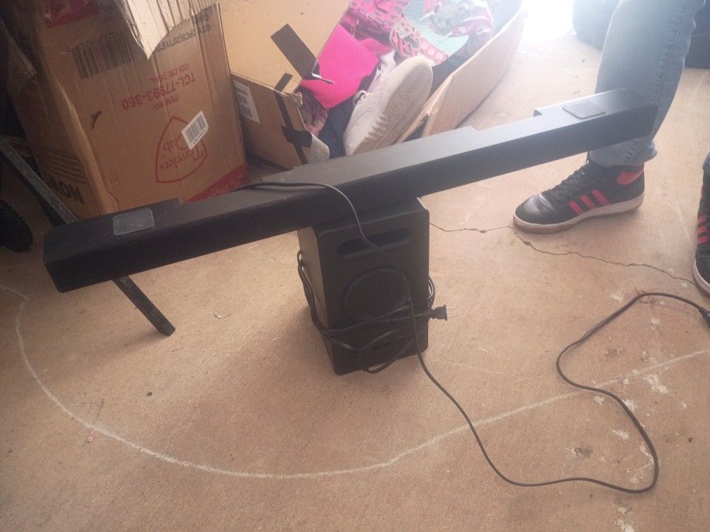 Vizio surround sound bar and subwoofer speaker. Has been well loved, but still works as it should.