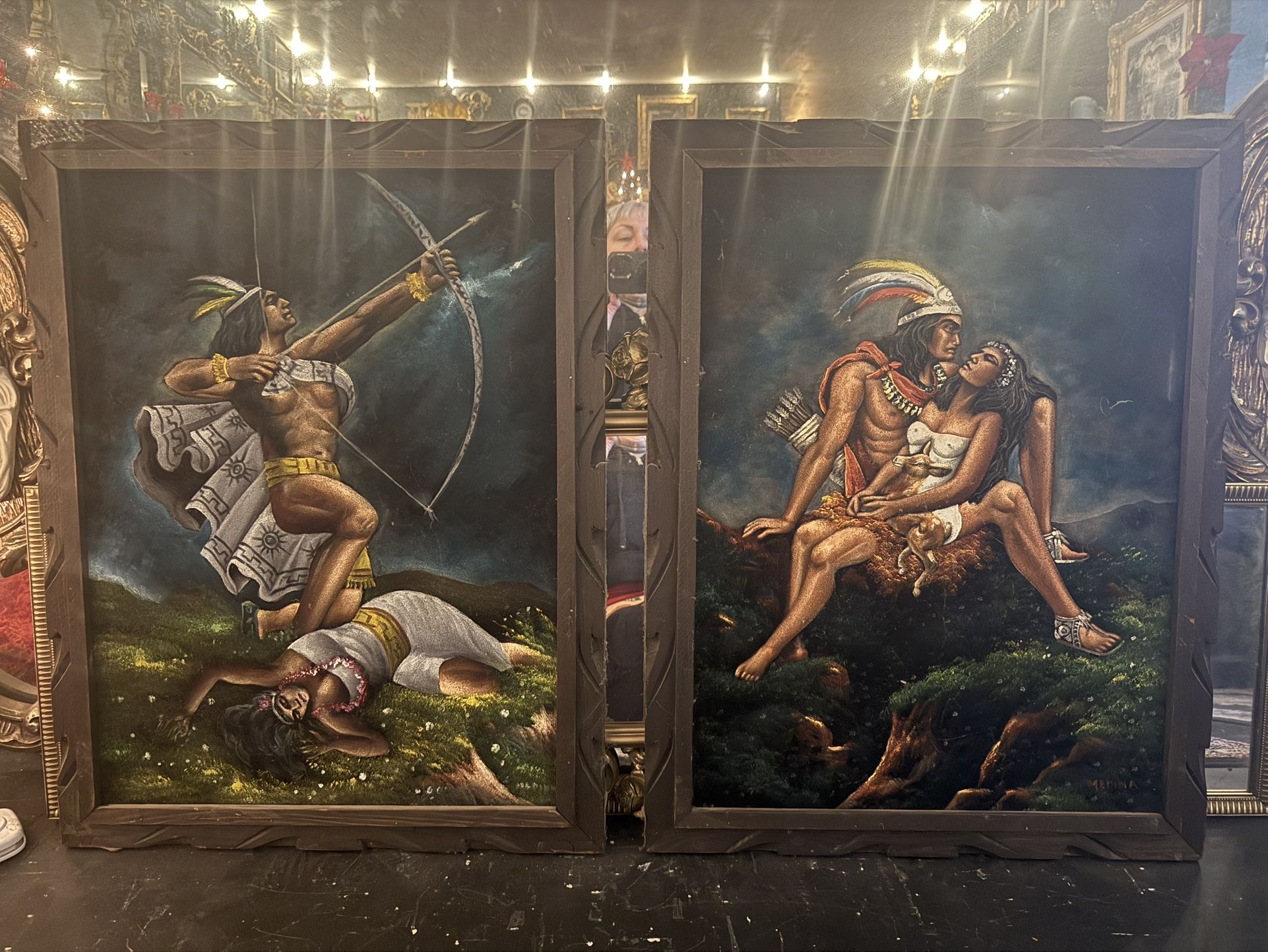 FRAMED VELVET PAINTINGS AZTEC MYTHOLOGY