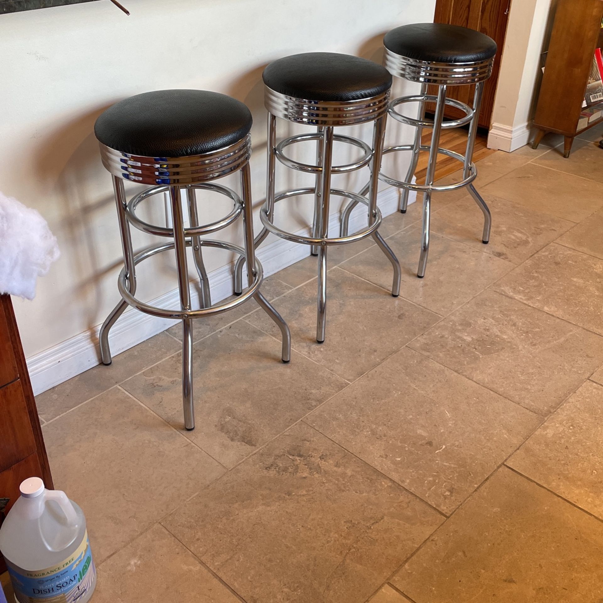 Set of Three - Black Vintage Style Barstools Diner style New reproductions of vintage diner bar stools. Less than a year old. Chrome and black leather upholstery in perfect condition. Seats 14” wide 29.5” height $100 for set of three