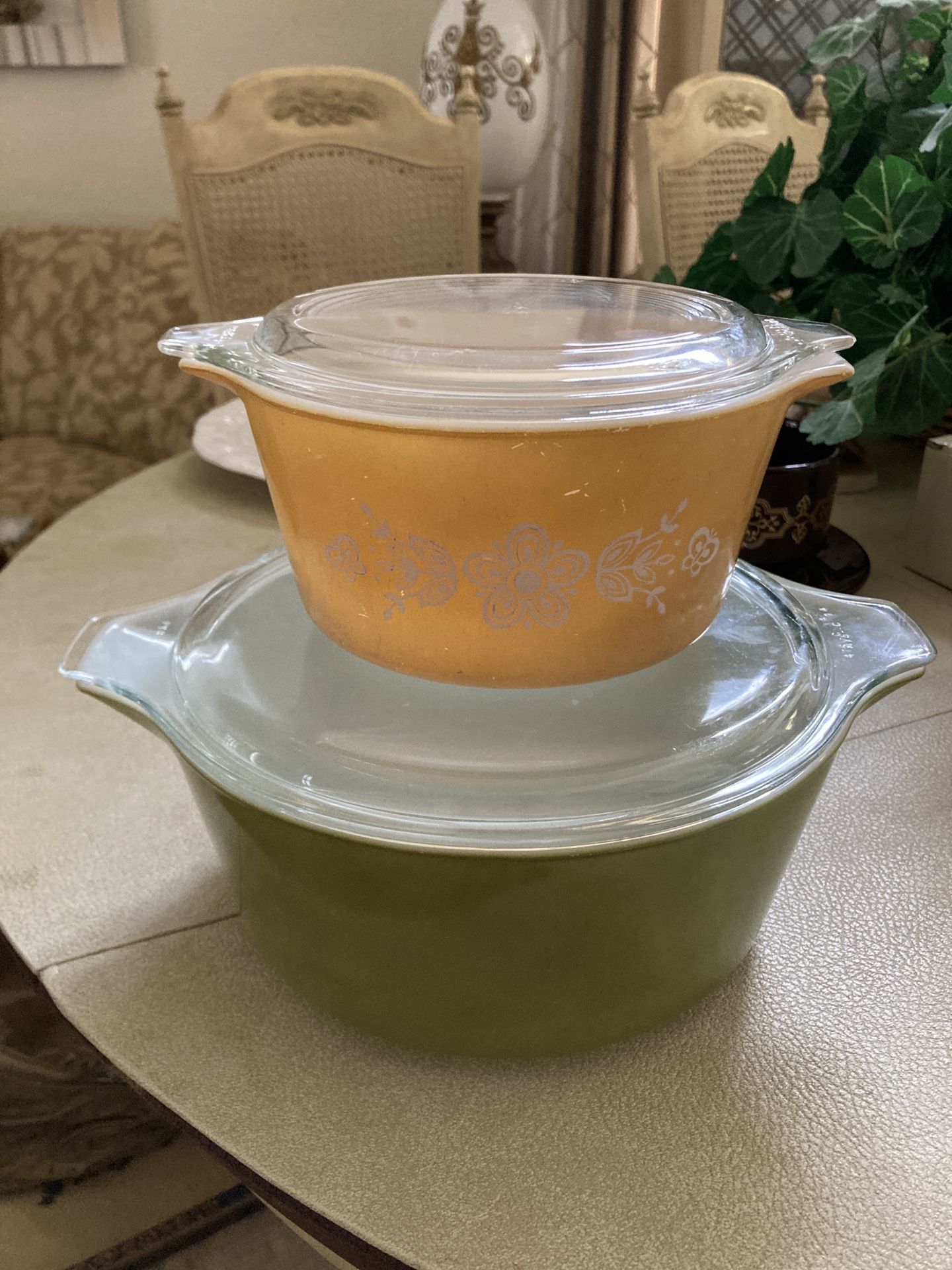 Top Dish • Pattern: Butterfly Gold (white floral on mustard/yellow) • size: 1½ quart (043) • With original clear lid Bottom Dish • Solid Avocado Green (very popular 1970s color) • 2½ quart (045) • With lid