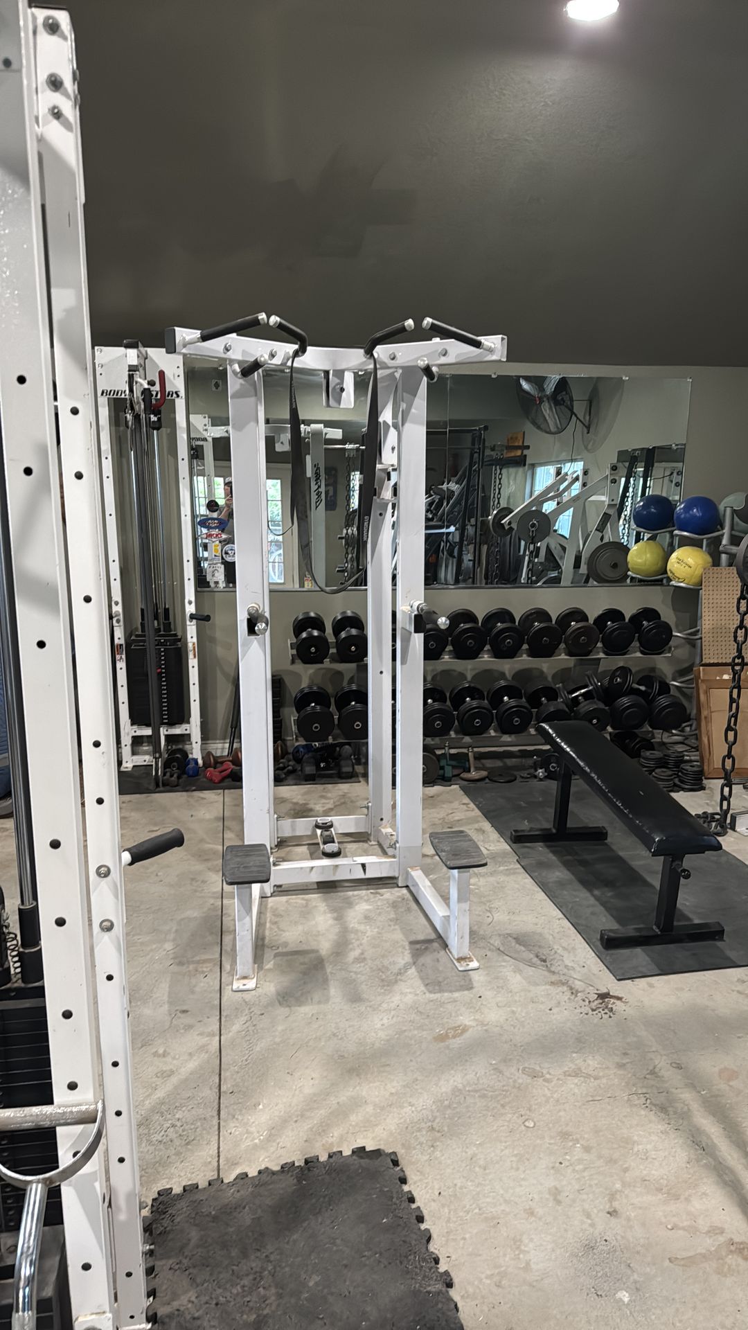 This came from a commercial gym in San Diego. It’s made by life fitness it’s heavy duty has multiple grips for pull-ups two widths for the dip area, they have extra wide and a narrow. It also comes with an extra thick spotting strap for assisted pull-ups and even assisted dips if you need it the machine weighs at least 200 pounds. It’s that heavy duty. We’re moving we’re not gonna take this with us otherwise we would never sell it. I love all the different hand grips for the pull-ups and the fact that I can go wide dip occasionally with a lot of weight.