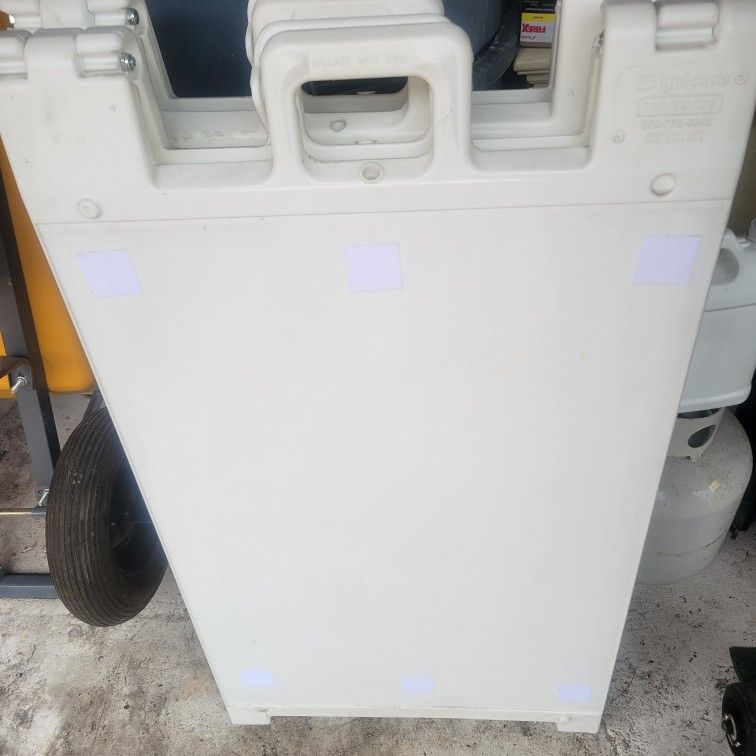 The Signicade Deluxe is a durable plastic a-frame sign stands that will not rust, splinter, or ever need painting. The Signicade Deluxe is 27"w x 45" h and it holds a 24"x36" sign panel (usually made from 4mm thick corrugated plastic). You can easily display a sign on EACH SIDE of the stand. The molded in handle provides easy portability. You can add internal weight to the stand (if needed). You should only put 5 lbs (or about 1/2 gallon) in each side. You will NOT want to fill them up all the way to the top with sand or they will bend.