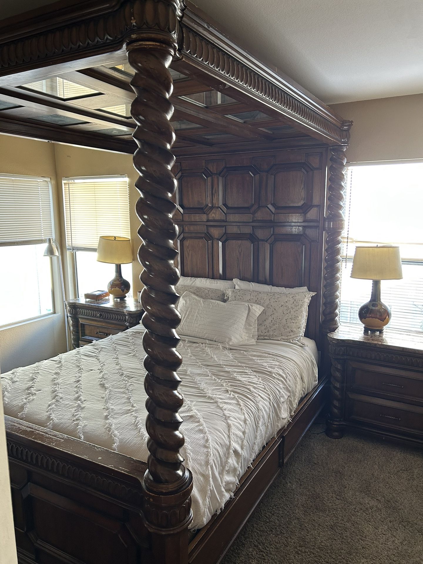 Luxury Bedroom set originally purchased for over $10,000 over a decade ago includes - 1 Wooden Dresser with marble top, huge mirror, 2 side mirrors that open up to be jewelry holders, 9 drawers, 1 little storage closet all with beautiful wooden details all around - 2 Nightstands also with marble tops, 2 big drawers and one drawers for books or papers, also but beautifully detailed wood work - 1 Queen size elegant Wooden frame with spiraling poles and mirrors on the top with stunning wooden details - 1 Tempurpedic Mattress and Mattress stand that’s adjustable and remote controlled! All in all, this bed set has been well kept and even though it does has scratches here and the ere and a few imperfections, it is still incredibly elegant and beautiful. I’m moving out of the country and must sell it asap, hence the price. Please serious inquiries only🙏🏻 Located in Tustin and you will need movers to move it because it is extremely heavy !