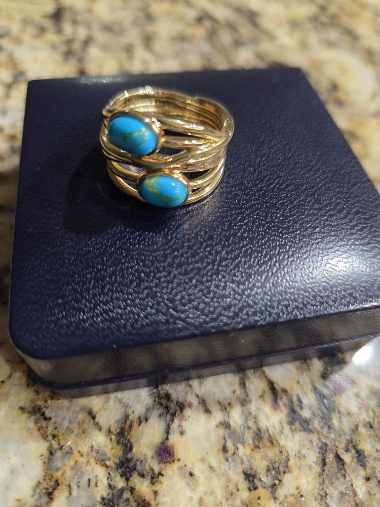Bold Gold-Tone Turquoise Statement Ring – Size 6 Make a statement without spending a fortune. This eye-catching gold-tone ring features a layered wrap design accented with two vibrant turquoise-colored stones. The stones have beautiful natural-style veining and color variation, giving the look of genuine turquoise while remaining lightweight and easy to wear. The multi-band design creates depth and dimension, making it a standout piece whether you're dressing up jeans and a tee or adding flair to a simple black dress. It has a rich, polished finish that catches the light beautifully. I am local Desert Ridge area Details: • Size 6 • Gold-tone metal • Synthetic turquoise-style stones • Comfortable, smooth fit It looks far more expensive than it is — perfect if you love bold jewelry without the bold price tag.