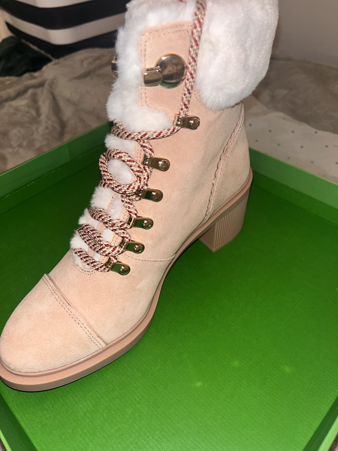 Tan suede with faux fur lining and gold-tone hardware; item sold/ labeled as an 8 but is not a true to size. Size fit is a 7