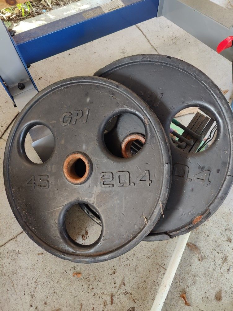 Two very used Olympic 45's. The rubber is coming off in some places. Rust in the middle. These were stored outside.