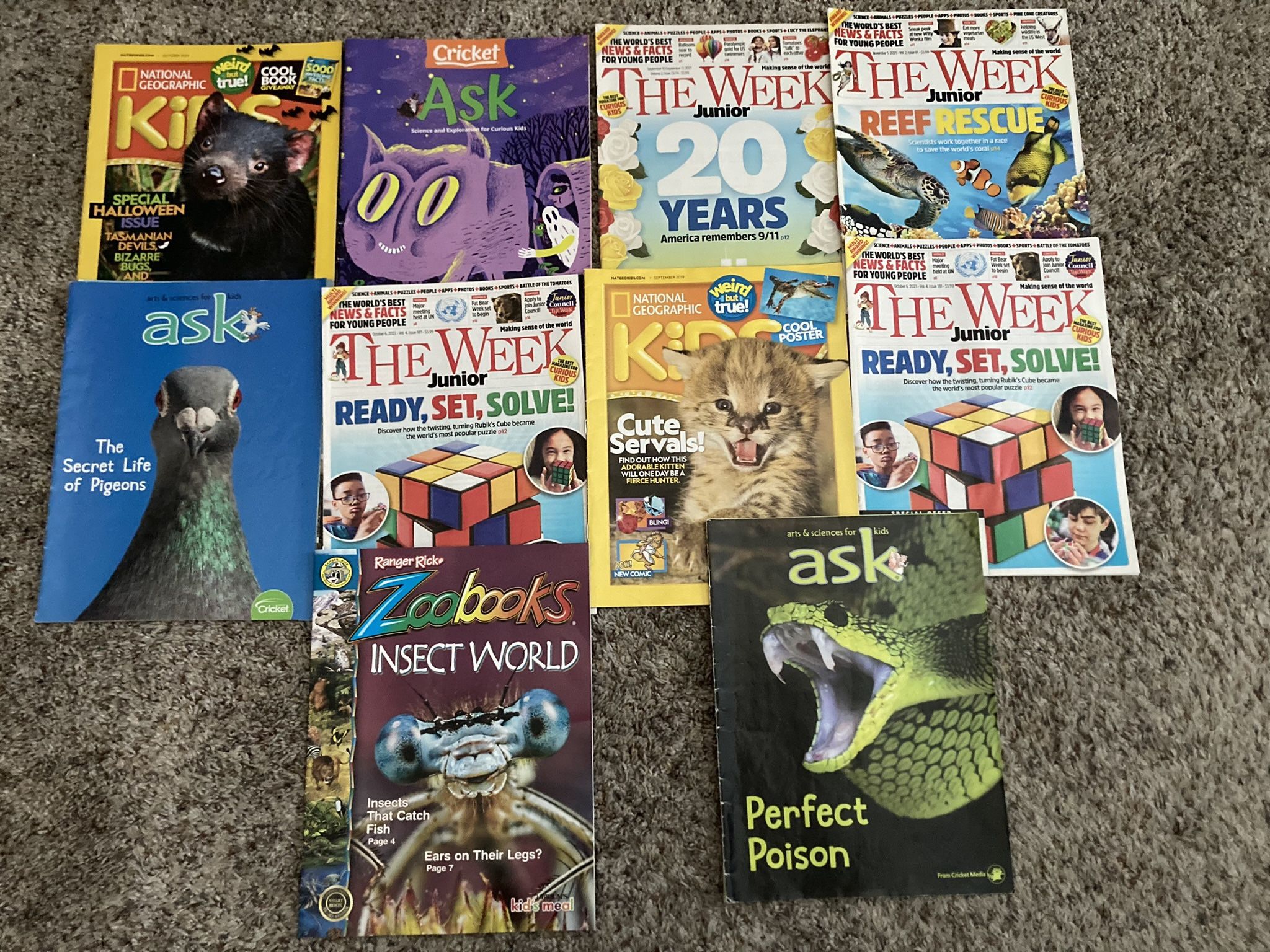 10 educational magazines—3 “Ask”, 4 “The Week”, 2 “National Geographic Kids”, & “Zoo books Insect World”. These are fun and interesting. They’re in good condition—no missing or torn pages. Great for summer reading.
