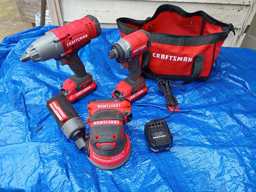 Brand new Craftsman half inch impact with a quarter inch drill driver and an orbital sander three batteries and a charger all brand new they've been taken out for testing to see what they were like and they are very good tools the impact is actually very surprisingly strong selling as a bundle for Christmas for $200 the impact alone cost $189 with no battery very good deal half market value pick up only in loganville
