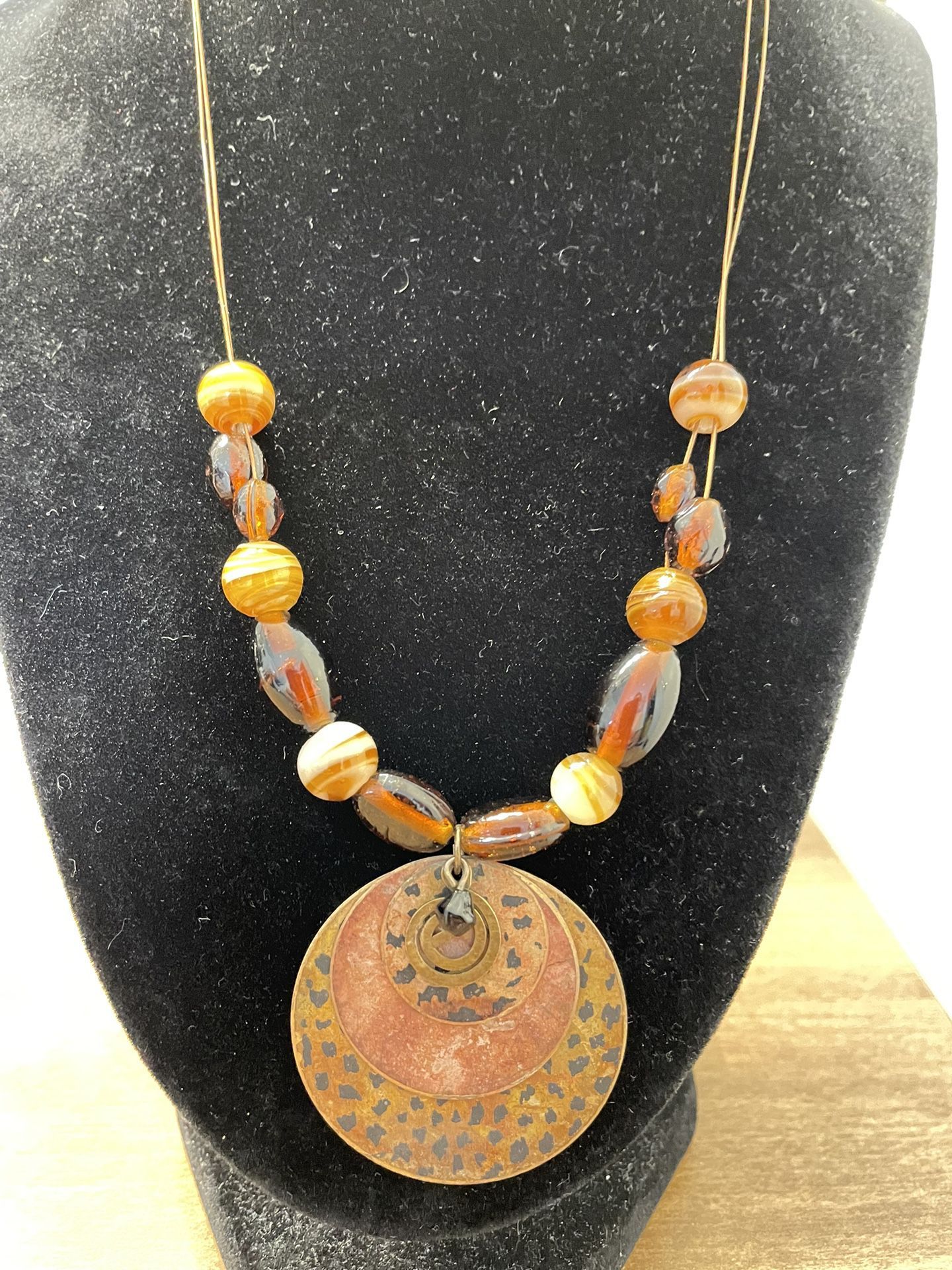 Very nice agate beads on a wire strand. Copper/brass pendant with black onyx bead. Clasp has onyx bead as well. Half off with a $10 minimum purchase if shipped(bundled with any item(s) on my other posts) Shipping only