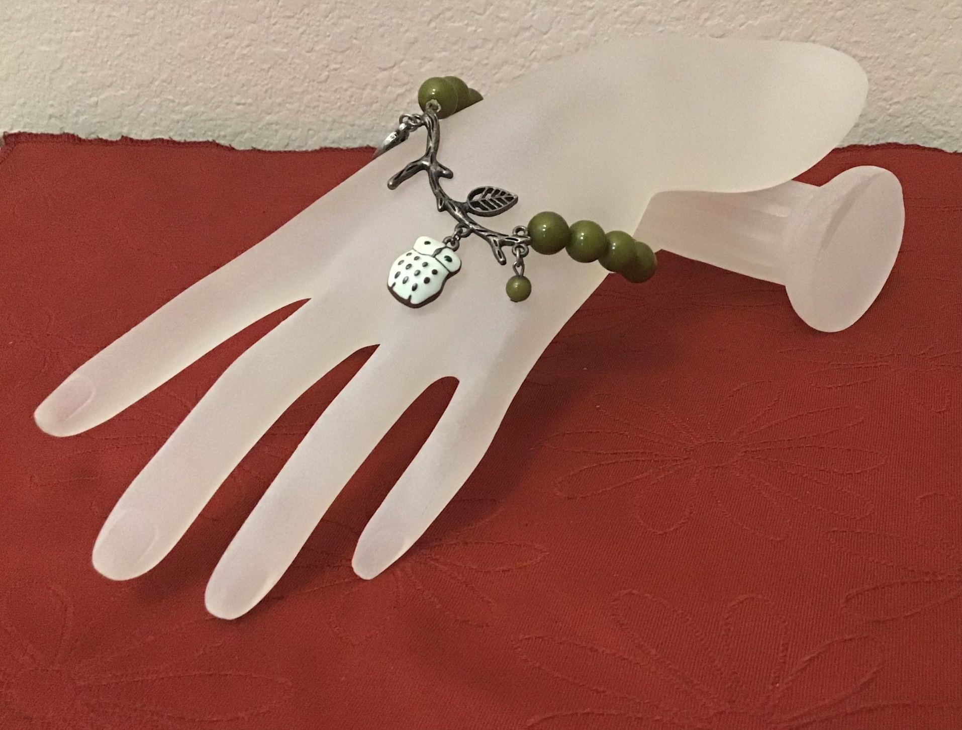 Handmade beaded Olive Green with Owl, Branch and Tiny Leaves Bracelet Size: 6 1/2”