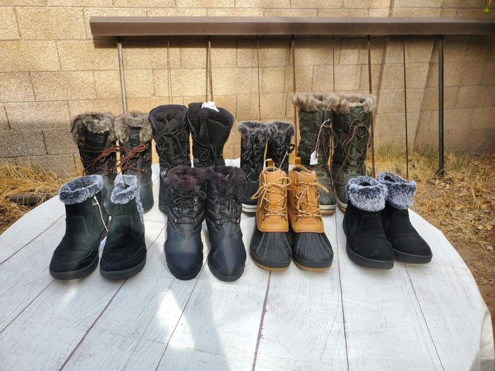 Boots pictured here are women's size 10. Other sizes are available. Khombu black boots with black faux fur trim. $28 Khombu black and gray all weather boots. $32 RF olive green boots. $26 Weather Spirit tall black boots. $26 Natural Reflections brown boots. $32 We have snow and winter clothes for the entire family. Infants, toddlers, kids, men and women. We have snow pants, bibs, jackets, gloves, hats, helmets and boots. Click on my profile page to see some of our offerings. We are located in Gilbert near Greenfield and Baseline. Pick up only. Cash only. SNOW, SKI, SNOWBOARD, WINTER