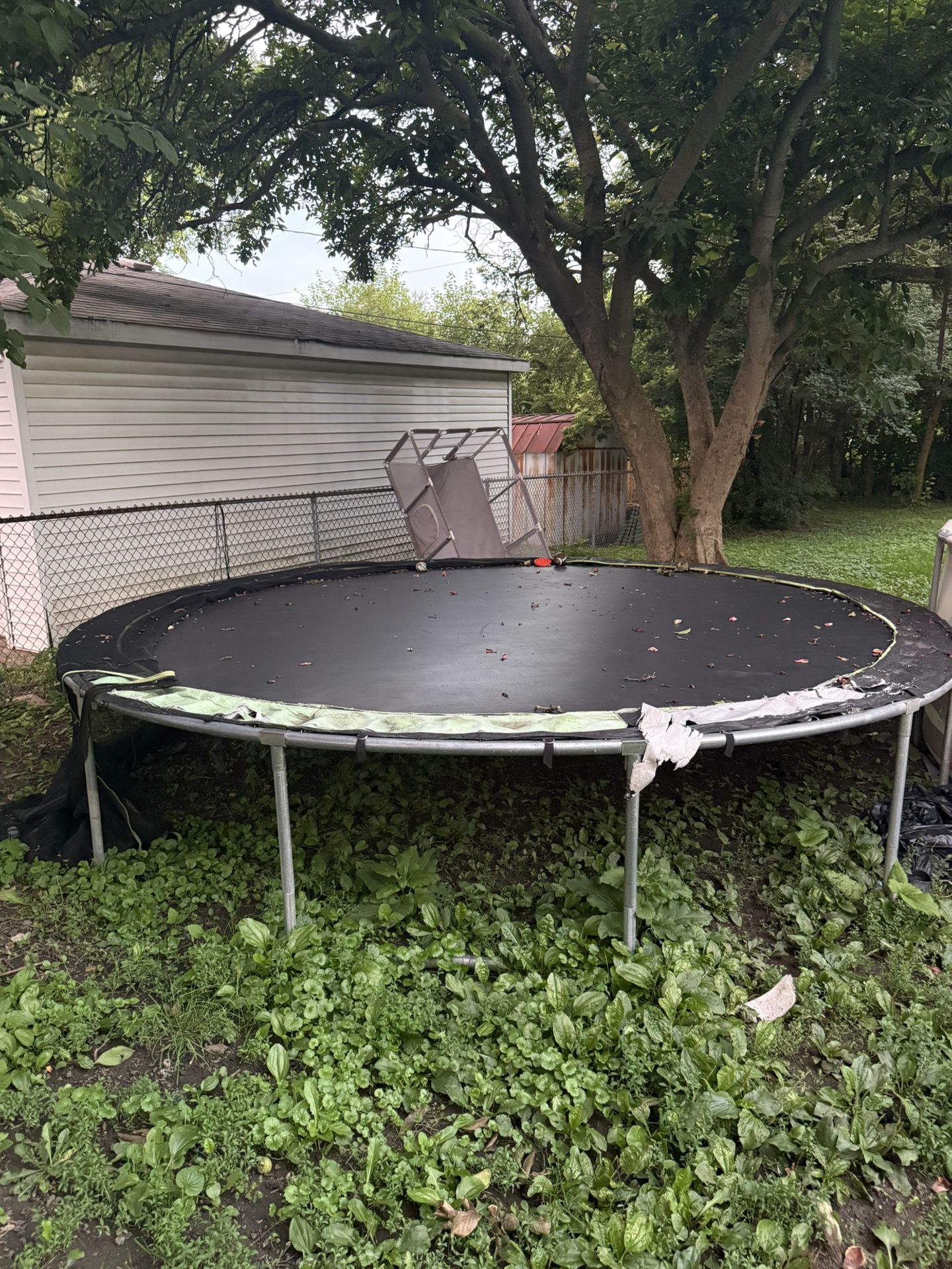 Great working trampoline! Very strong and sturdy. No tears in fabric. The springs were covered so no rust. Kids are bigger now and no longer use it. Comes with the poles and net, but the zipper does not work.