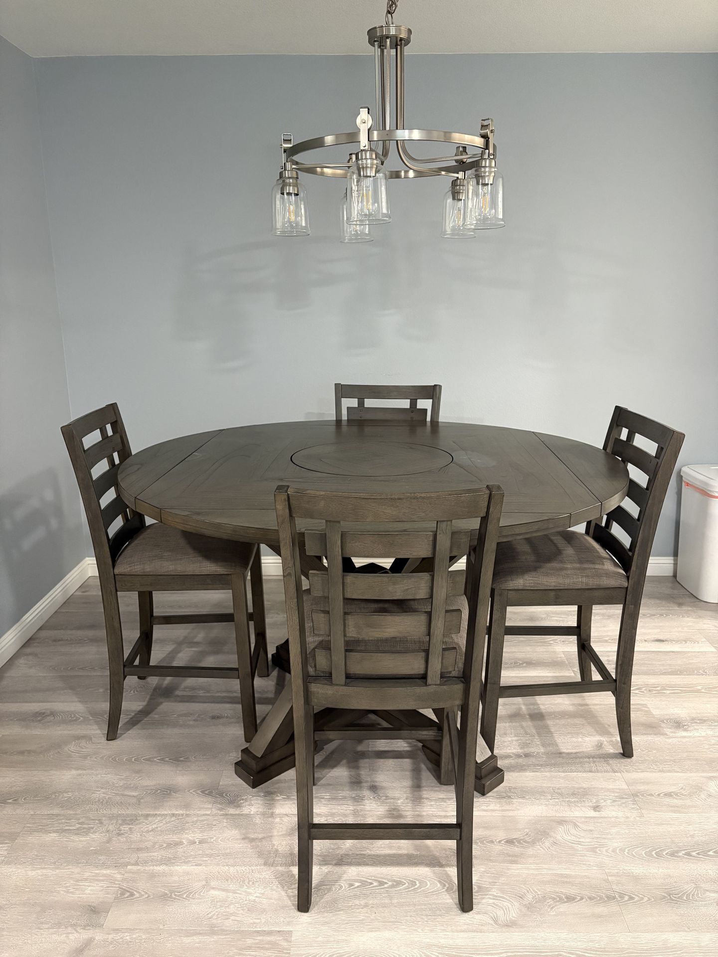 Dinning room table and 4 chairs less than 4 years old purchased at Mathis Bros.. table is 5’ round that coverts into a 46” square table as well and has a lazy Susan in the middle of the table.. comes with 4 padded chairs. Table has 2 small finish issues on the table as seen in pictures.. cash only and you pick up.. please see all other furniture postings as well