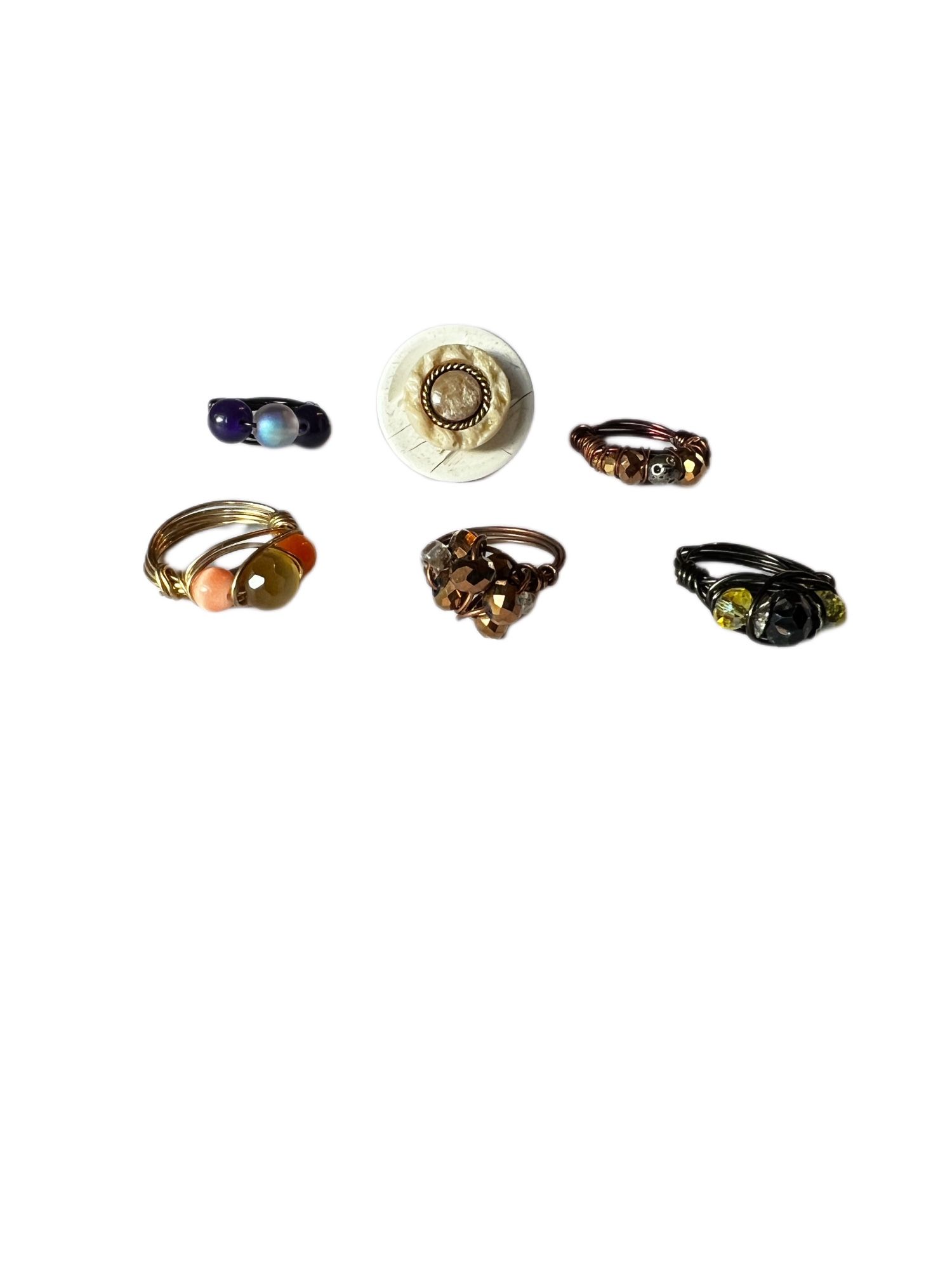 Six wire beaded rings, ranging from 3.5-7 in size, colors in shades of ivory, browns, bronze, orange, black, purple.