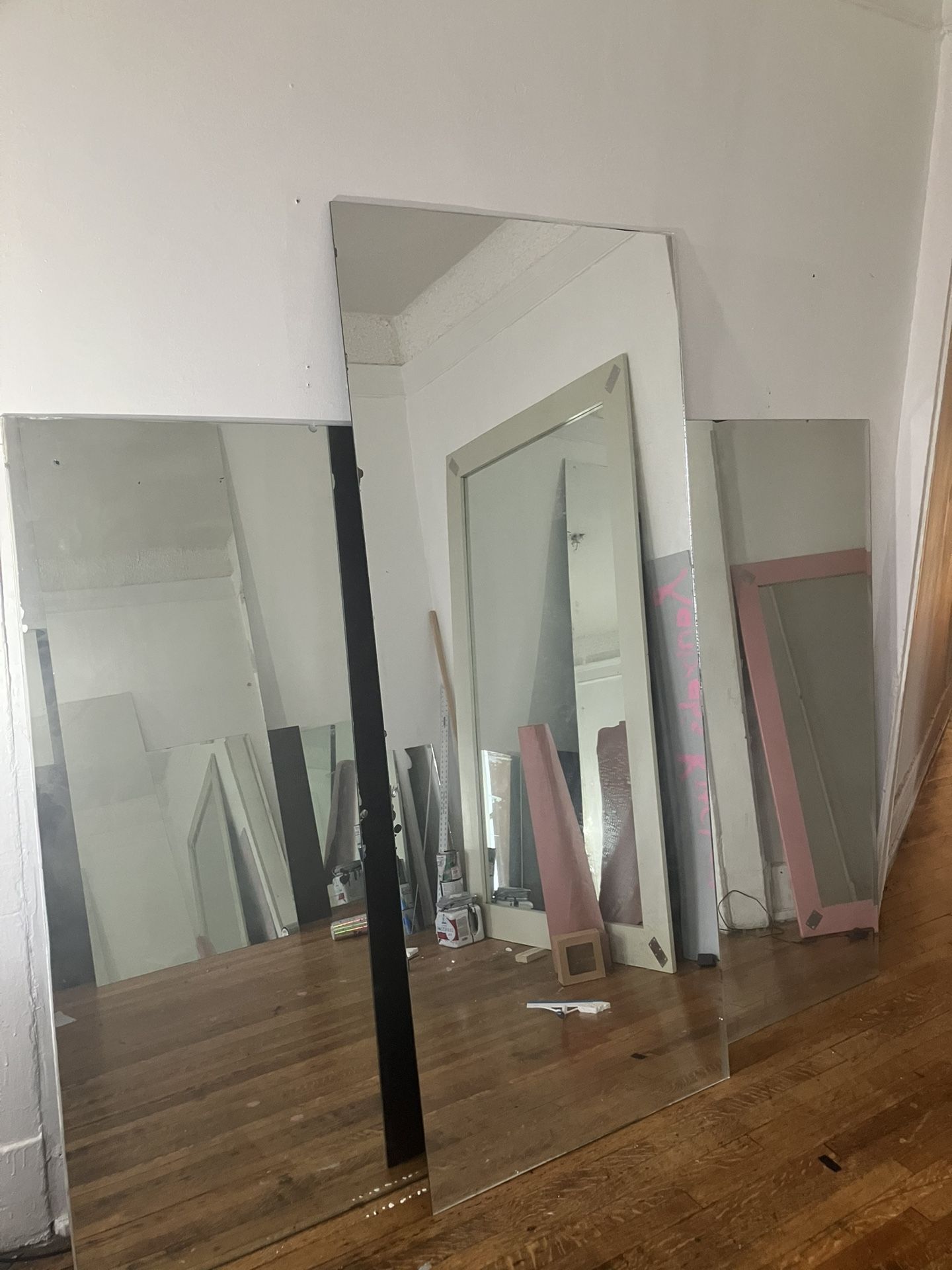 I have several large to extra large frameless mirrors for sale. The one you see on the frame can be easily taken off. The largest one is 100x35 inches. The next is 90x45 inches. The others are smaller but still large. I’d like to sell them in bulk for $200. I’ll sell them 1 for $50. There Are 6 altogether. Great for someone who wants to frame them or install a gym. I’ll also throw in a glass cutter if you buy them all. They need to be cleaned and some of them have minor damage that can either be covered, ignored, or trimmed off with the glass cutter. They are located on the third floor, so you’ll need someone strong to help you carry them, and a vehicle large enough to transport them.