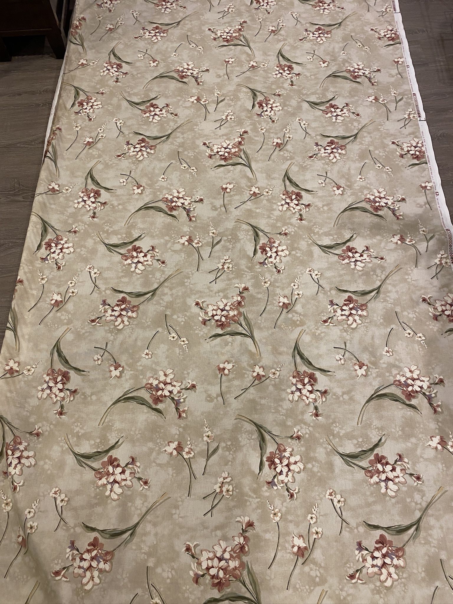 2.75 yards Waverly Fresco Di Fiori Floral on Beige Background Fabric 54” wide (102” long) It is on a roll. It will need to be folded if shipped. Sewing