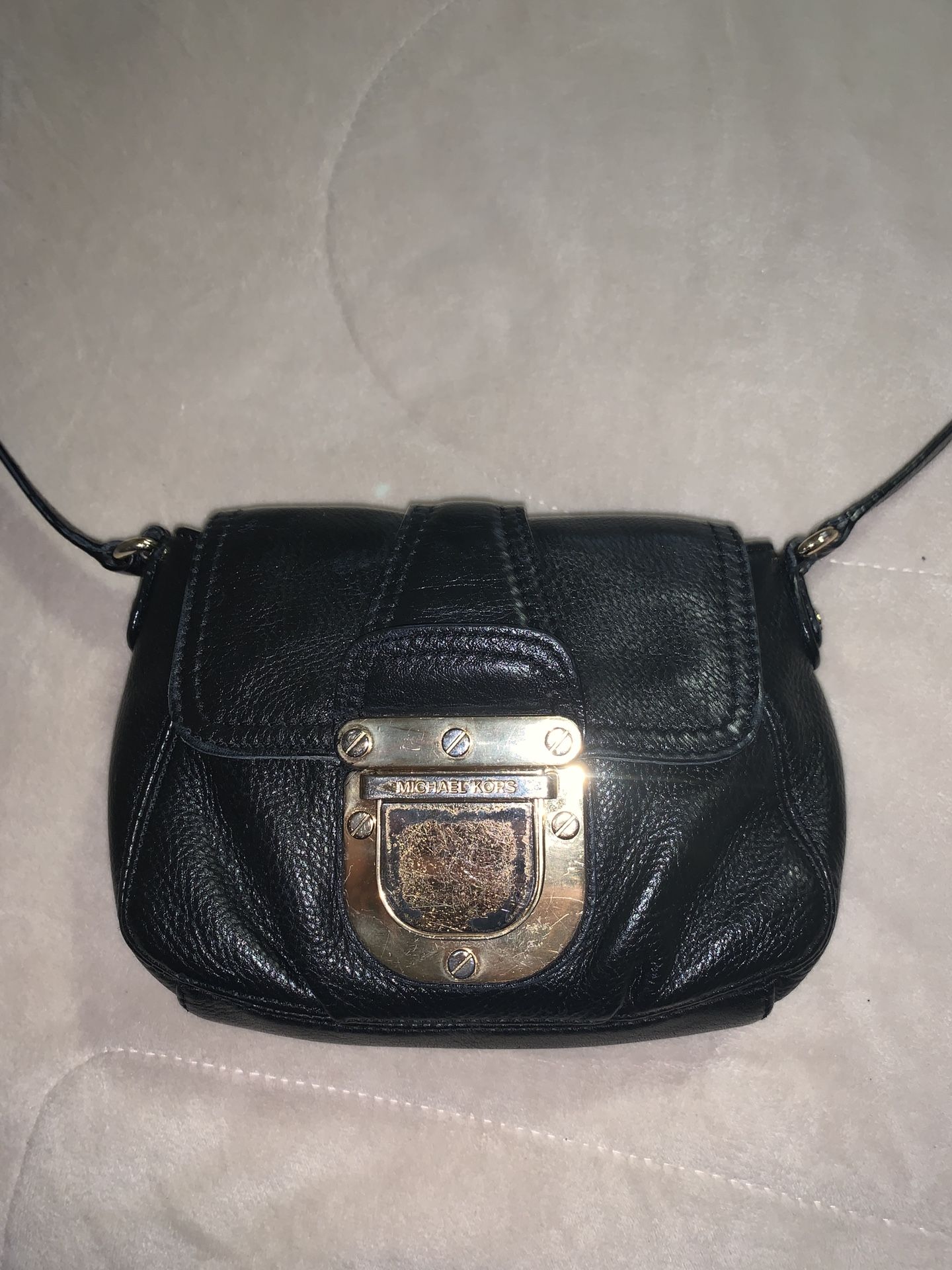 π―% Authentic Small black leather crossbody with gold tone hardware, with gold push lock closure and long adjustable strap. 2 inside pockets fits, phone,wallets,keys etc. There is some scratching on hardware, ( look π at photos) Look π at last photo for Approximately measurements Smoke free home Go ahead make me an offer USED USED USED USED USED USED USED