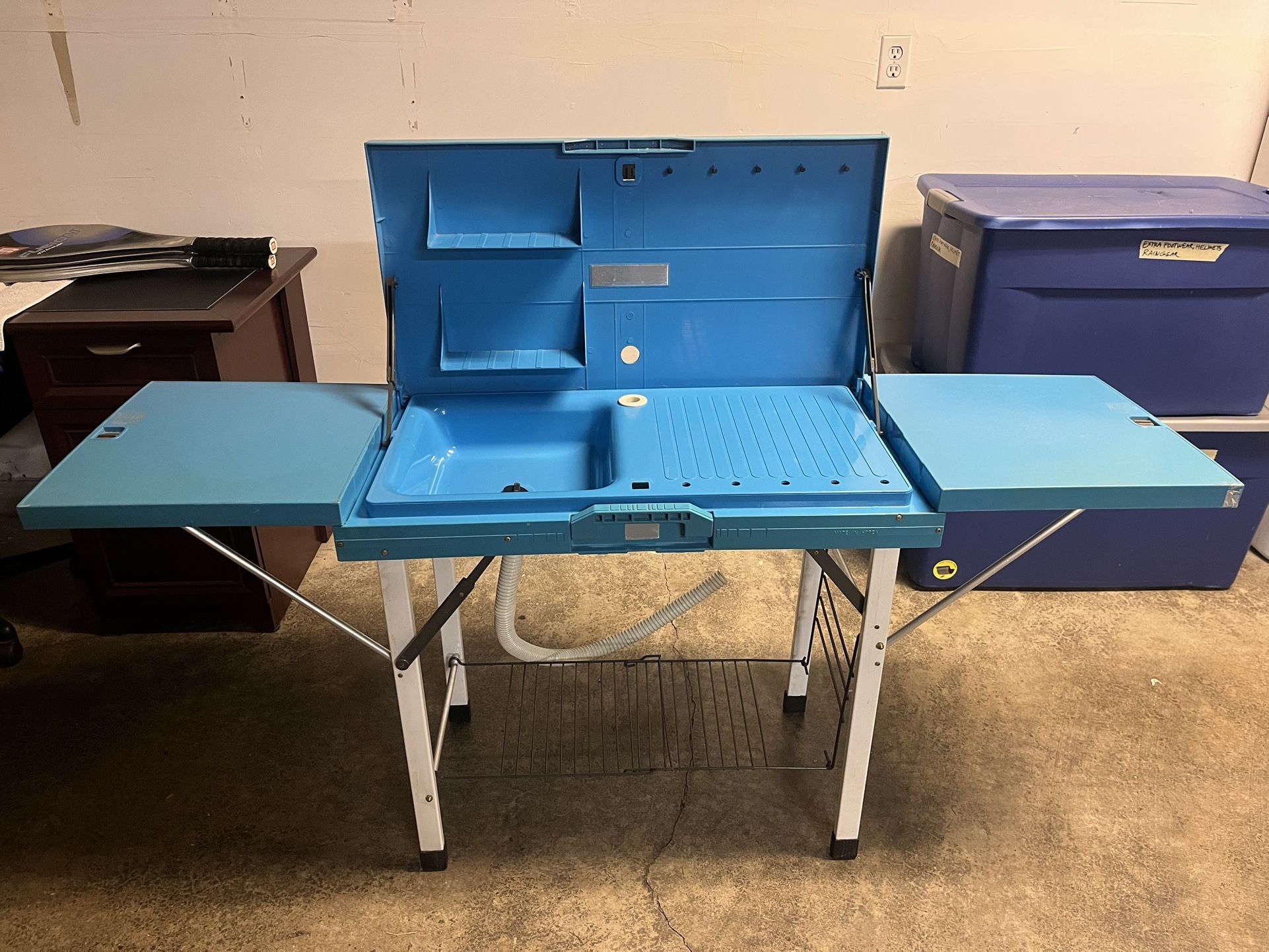 Great little vintage camping kitchen with sink and sink hose, under wire shelf and 2 small shelves above sink. 33”w closed 56” open with side tables out 17” deep Folds up in to store; with carry handle.