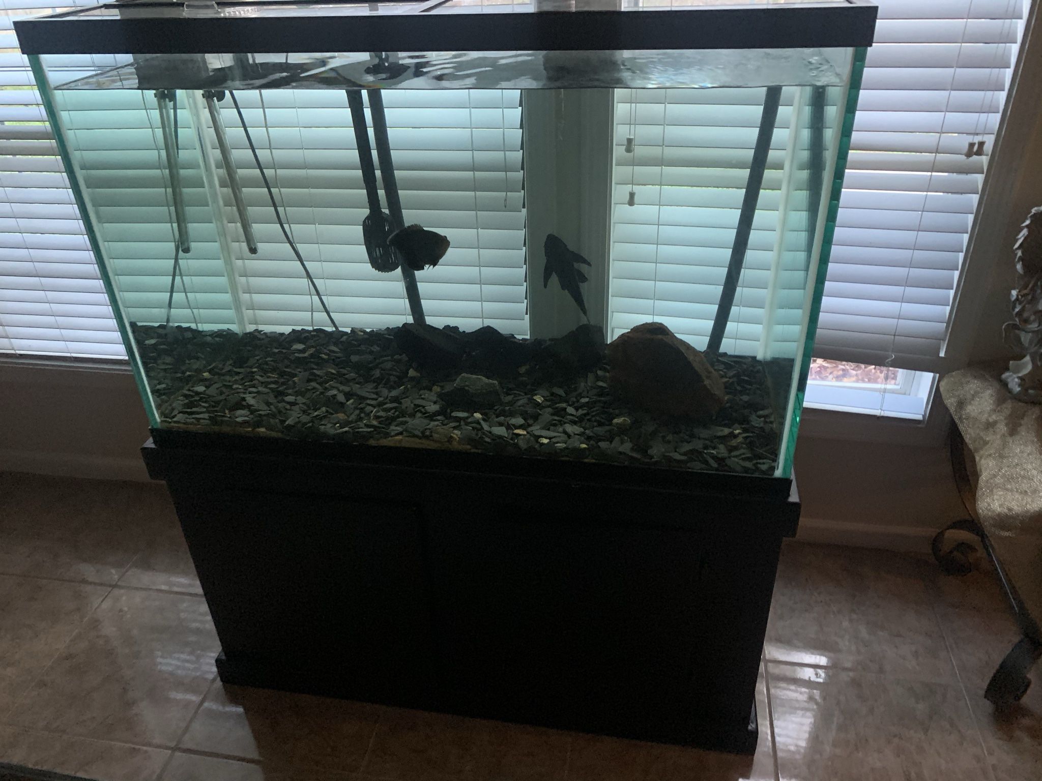 A used tank has no leaks and has glass lids Tank and Stand only!! Yes it’s available and must come pick up