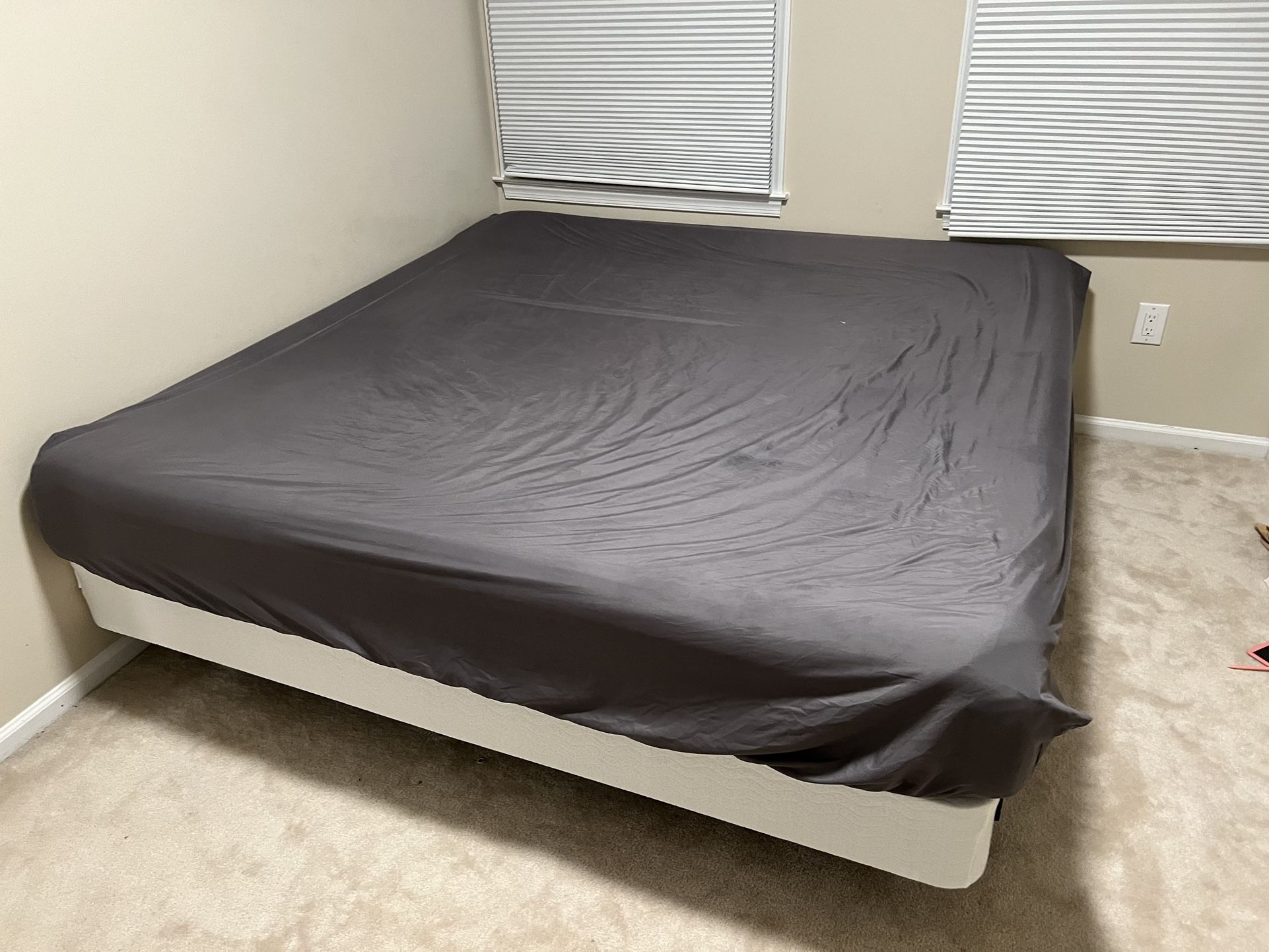 King size bed with mattress, box frame, headboard and bed sheet.