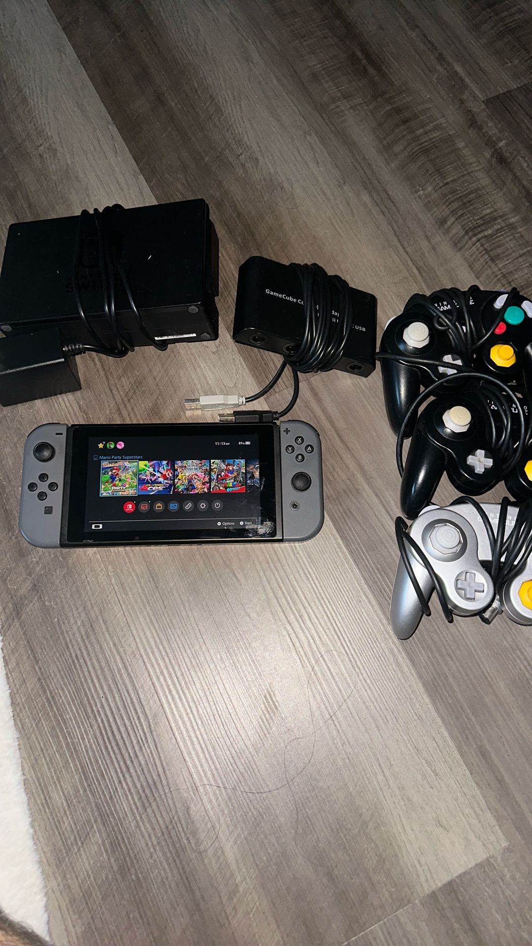 The Nintendo comes with the dock, an adapter with 3 controllers. No games included.