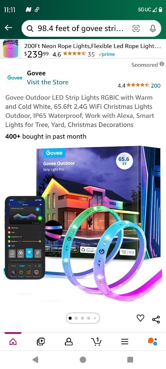 Govee Outdoor LED Strip Lights RGBIC with Warm and Cold White, 65.6ft 2.4G WiFi Christmas Lights Outdoor, IP65 Waterproof, Work with Alexa, Smart Lights for Tree, Yard, Christmas Decorations 400+ bought in past month I buy in bulk it says 98.4 ft on the box however there's only two strips in there making it a total of 65.6 feet Everything is in the box so I'm selling it that way can meet in Green Cove springs also you can buy 32.4 ft of led strip on Amazon to make it a total of 98.4 ft