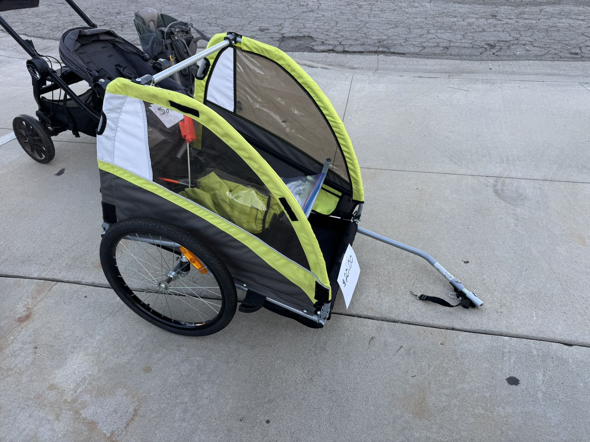 Slightly used. Like new. Folds for storage. Can be used as stroller. Connects to bike st the wheel. Garage sale item come get it!