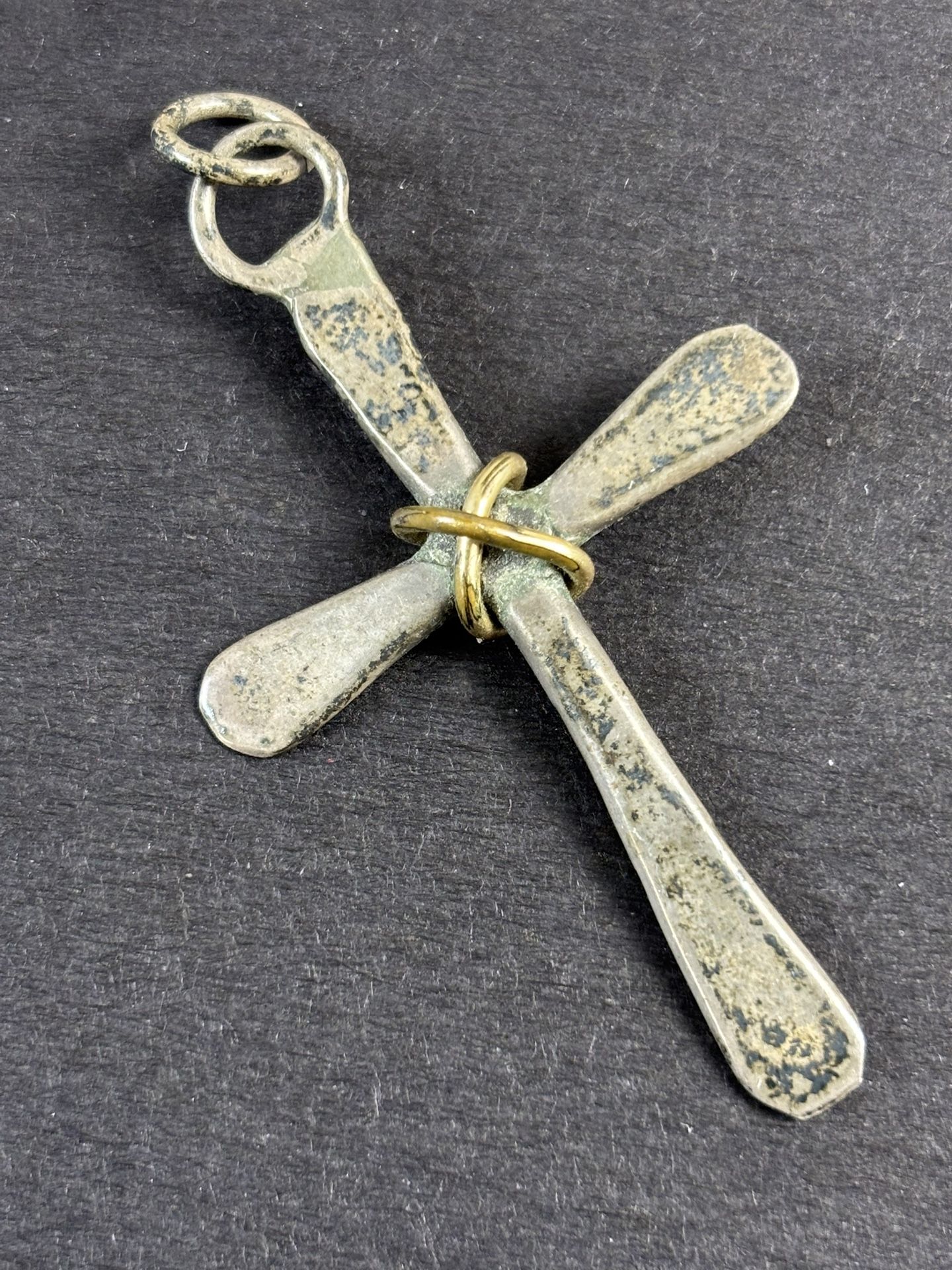One-of-a-kind, handmade, vintage, primitive, cross pendant. Fantastic patina on this piece gives it an amazing aged character. There are no markings indicating the metal, but I suspect silver. It doesn't seem heavy enough to be lead. It has a similar patina to other Sterling Silver pieces in the collection. There is no rust to indicate iron. Width: 35 mm (1-5/8") Length: 50 mm (2")