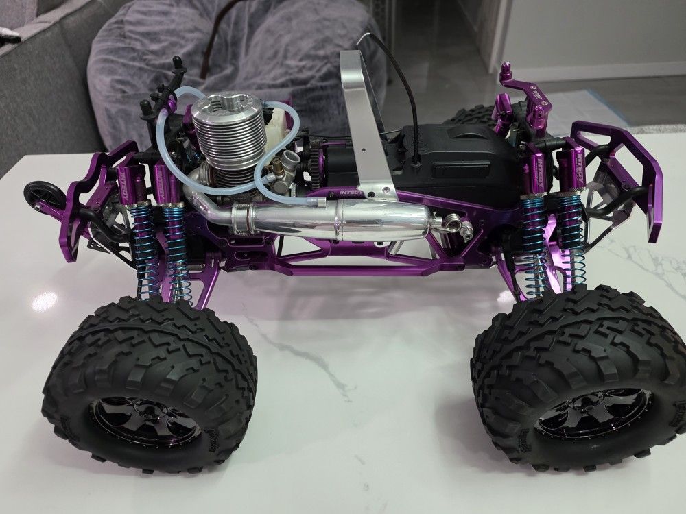 HPI Savage I built probably 10 to15 years ago . Integy shocks , bumpers, frame, upper and lower arms , skid plates, wheelie bar, tank protector Nova Big Block engine only broken in , Nova custom cooling head and exhaust . Rare and Elusive 3 speed transmission. Brand new wheels and tires, roto start enabled. No transmitter but has a receiver. Will trade for DJI drone